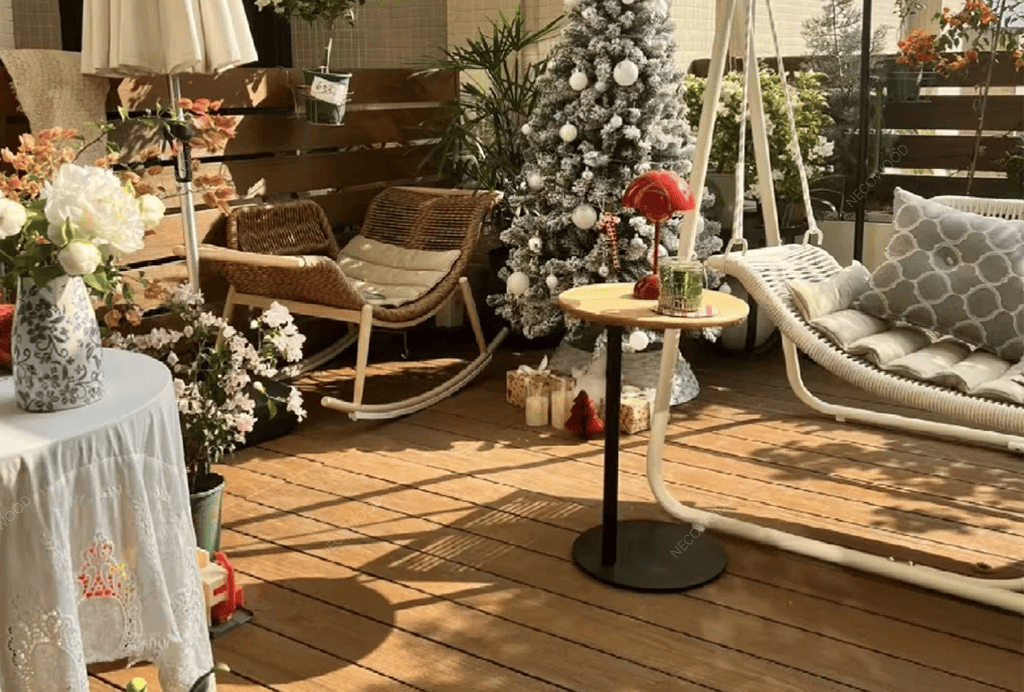 발코니는 날씨 변화에 지속적으로 노출됩니다. 천연 목재와 달리 Necowood WPC 데크는 목재 섬유와 고분자 재료의 복합재로 만들어져 물, 자외선 및 흰개미에 대한 탁월한 저항성을 제공합니다. 폭우가 내리거나 강한 햇빛이나 습도가 있는 경우에도 Necowood 데크는 색상과 구조적 무결성을 유지하여 변형이나 퇴색을 최소화하면서 긴 사용 수명을 보장합니다.